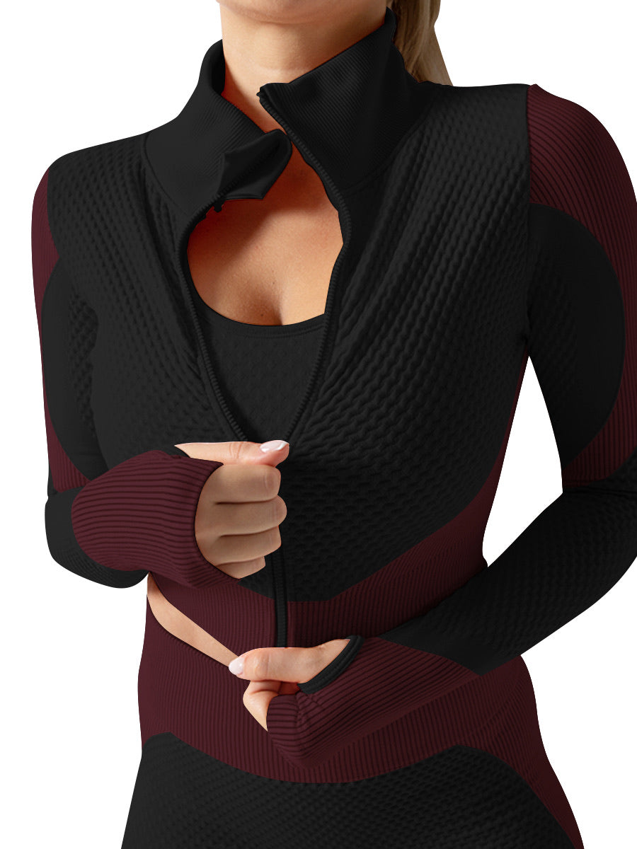 Push limits in the Motor Sport Three-Piece Set, built for power, movement, and sleek performance. This flexible activewear ensemble features a zip-up top with thumbholes, a seamless crop sports bra, and high-waist form-fitting leggings that enhance every curve. Made from high-elastic, moisture-wicking, and quick-drying fabric, it delivers ultimate comfort and support during any activity—from running and spinning to yoga and biking. With its sporty silhouette and bold texture, this set blends performance and style for an effortlessly confident look.